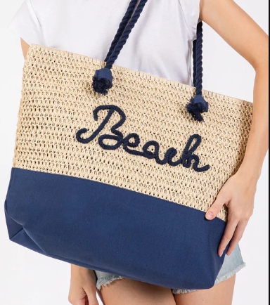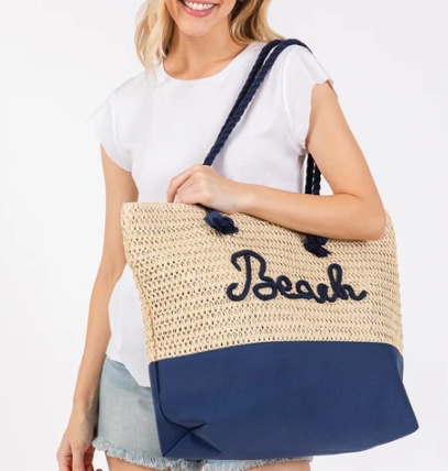 Straw Beach Tote in Navy